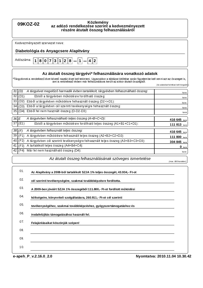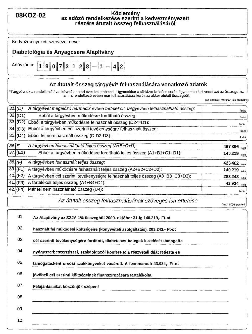 A Diabetológia és Anyagcsere Alapítvány 2005-ben felajánlott és 2006-ban megkapott 196.574,-Ft 1 %-os felajánlásokból 156.065,-Ft-ot tartalékolt 2008. évre. Ezt az összeget a nővérek és orvosok továbbképzésére költi el.