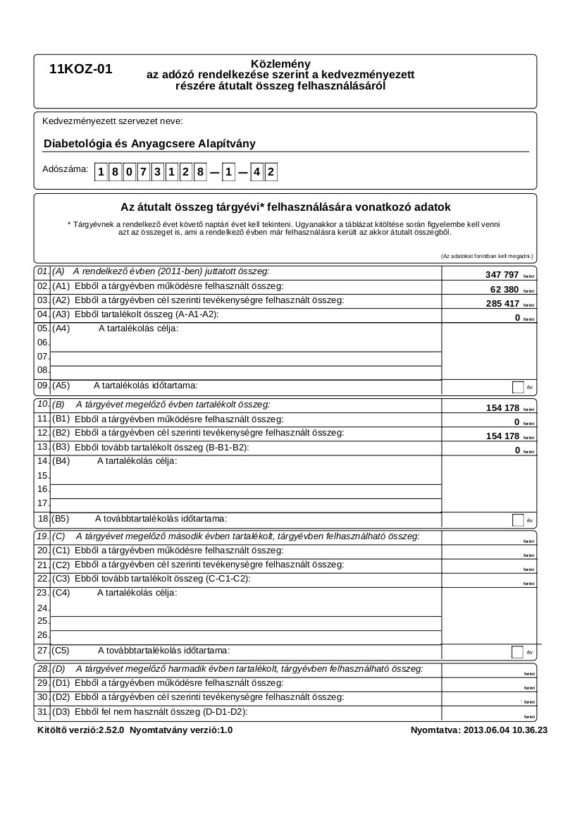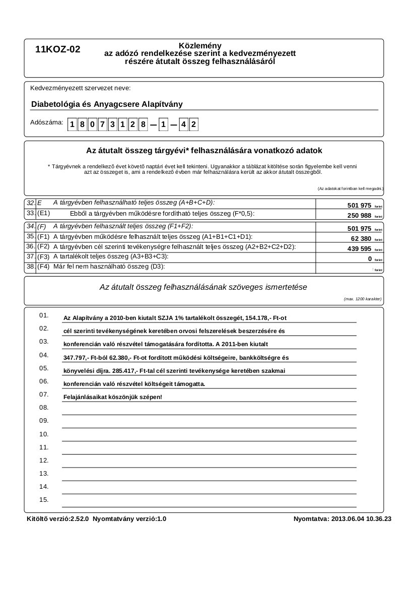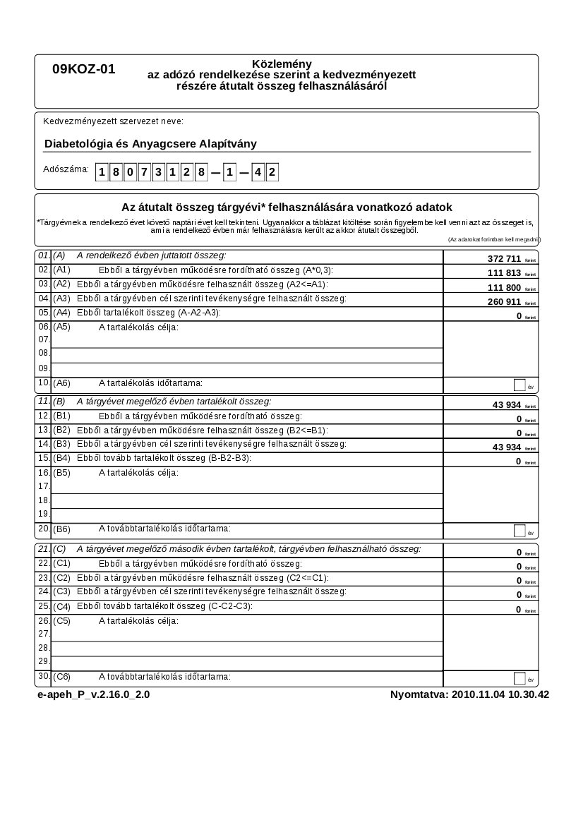 1% felhasználásáról - 2011-ben benyújtott APEH bevallás